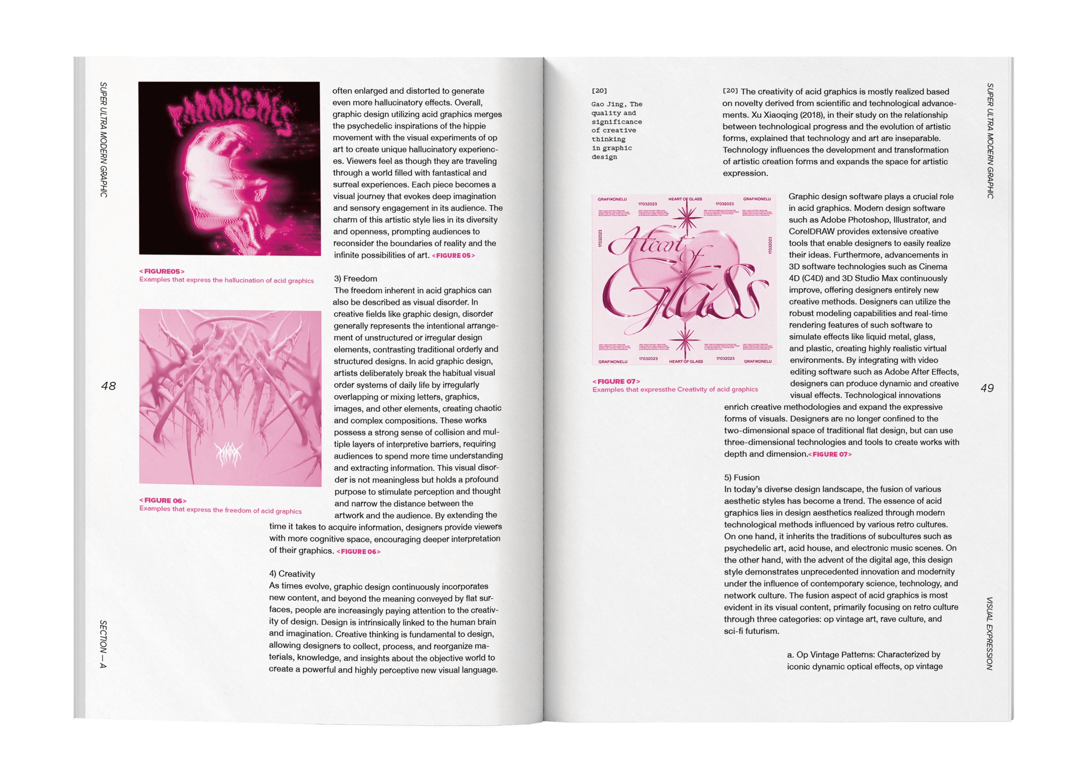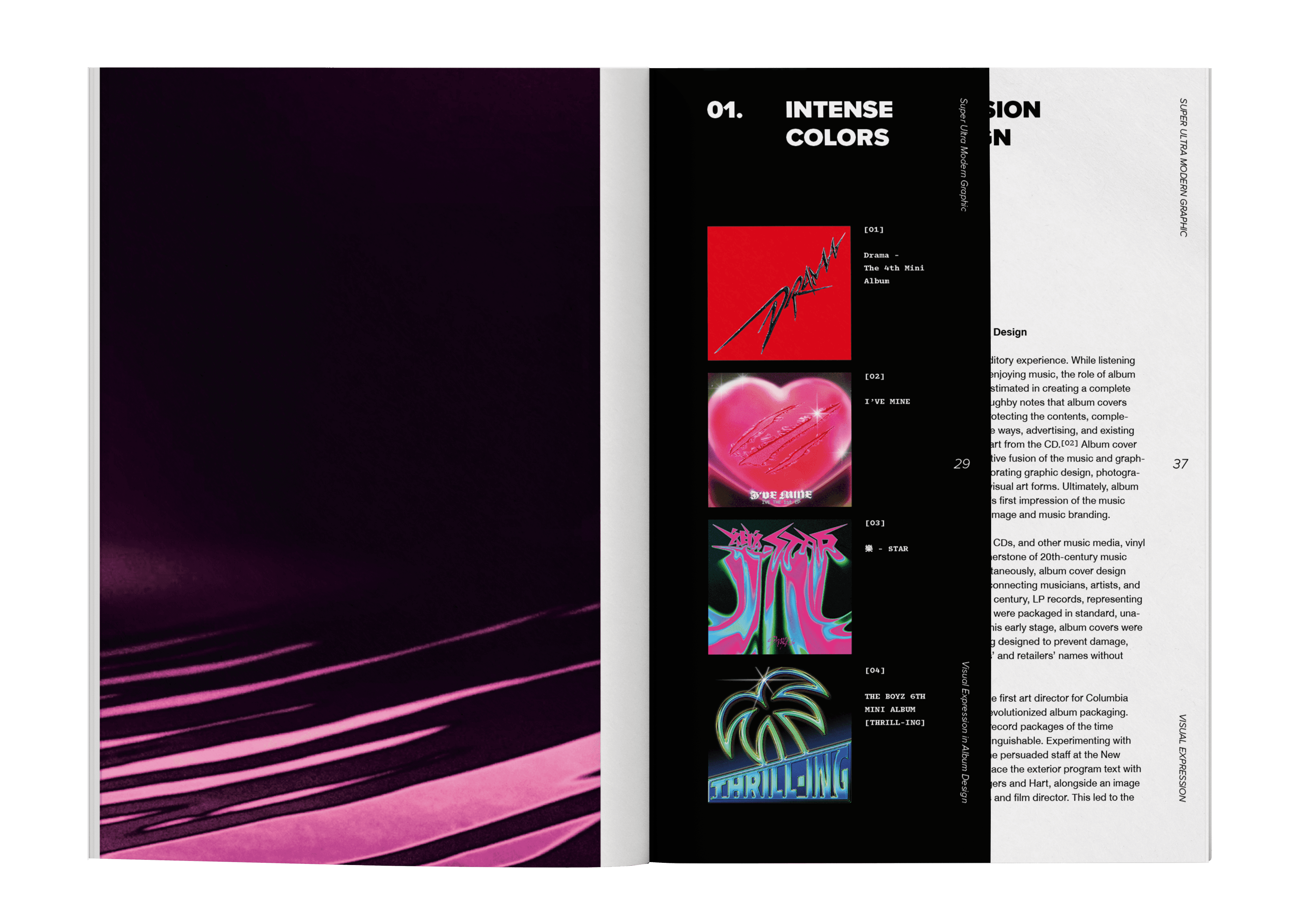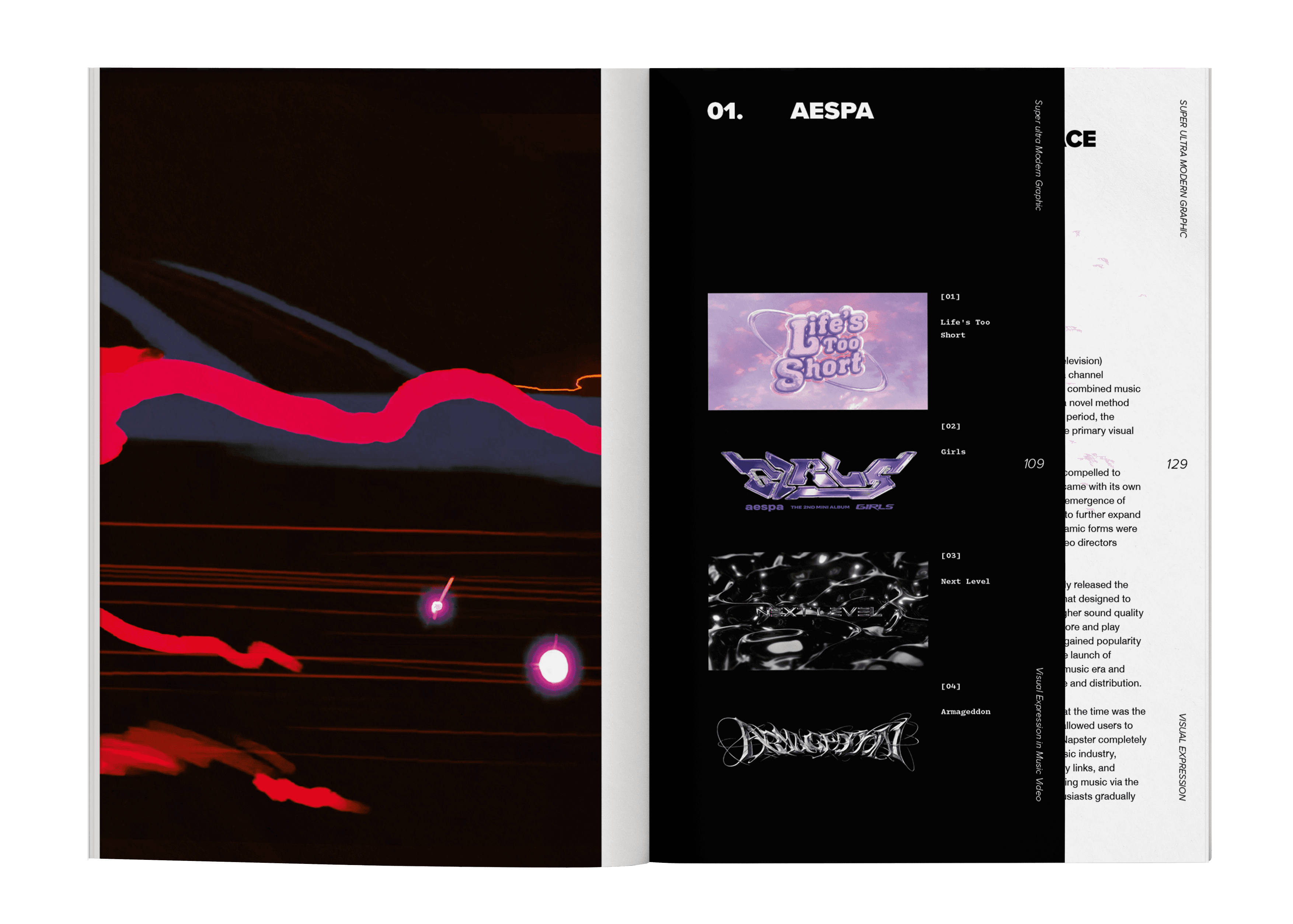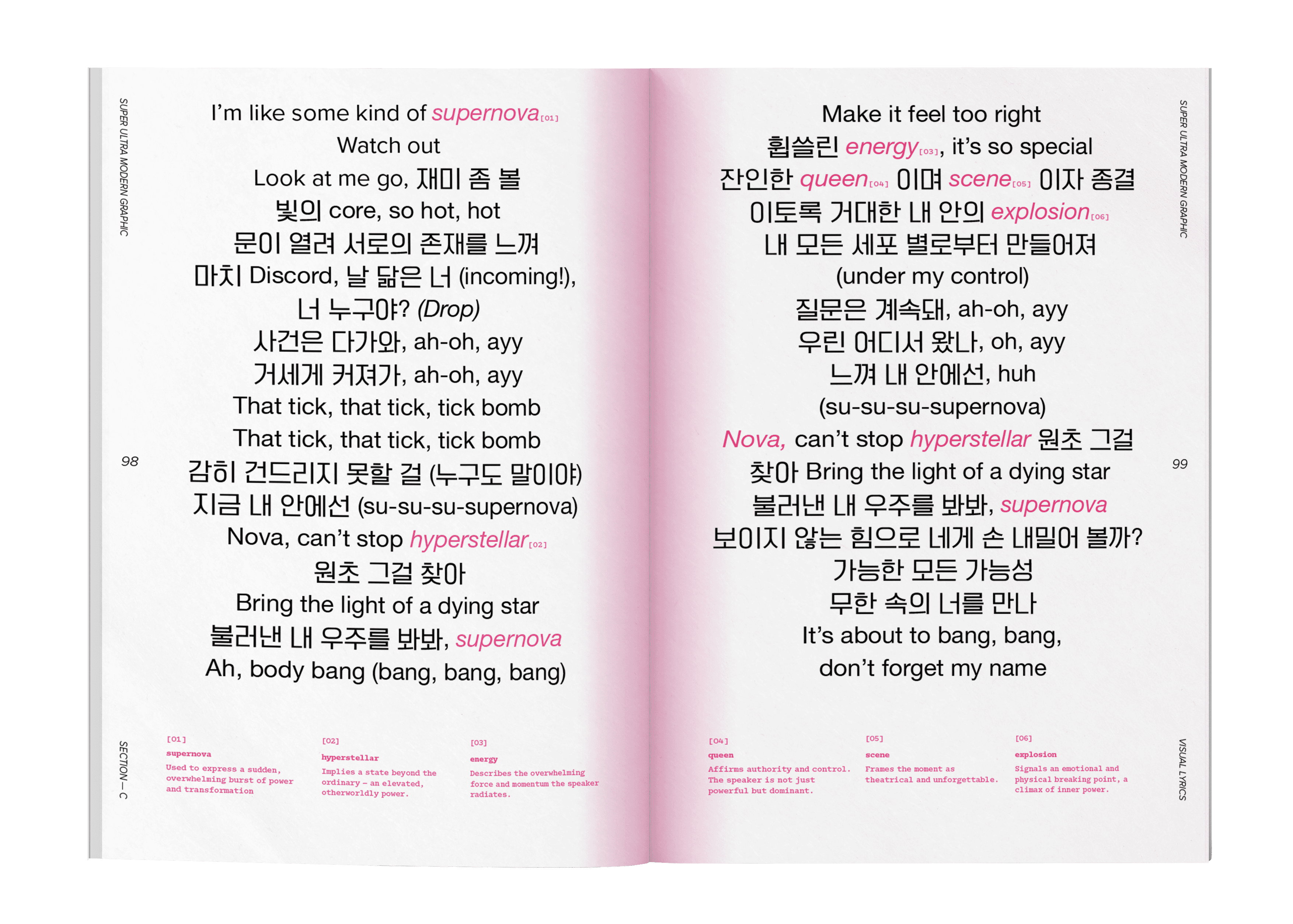 SUPER ULTRA MODERN GRAPHIC is a printed publication that dissects and catalogs the hyper-stylized visual language of contemporary K-pop. The project deconstructs the genre's defining aesthetic codes—maximalism, Y2K nostalgia, vivid color palettes, and rhythmic editing—translating these kinetic elements into a static print medium.